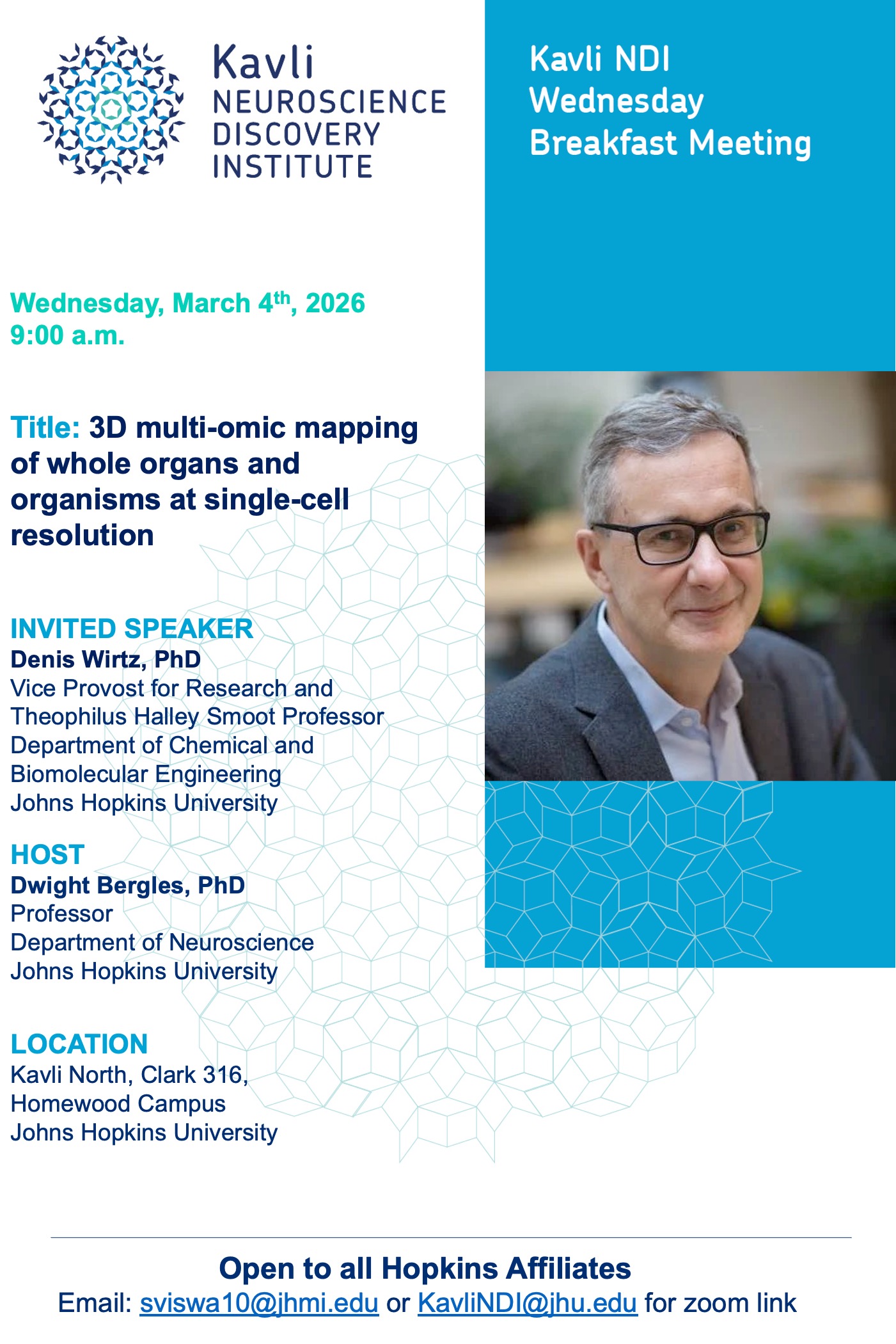 Kavli NDI hosts a monthly breakfast at our Homewood campus. This meeting serves as a forum to bring the Hopkins community together to brainstorm ideas, discuss current research, and set the stage for collaborative science across the community. Open to all members of the Hopkins community-- please email kavlindi@jhu.edu or sviswa10@jhmi.edu if you wish to attend.