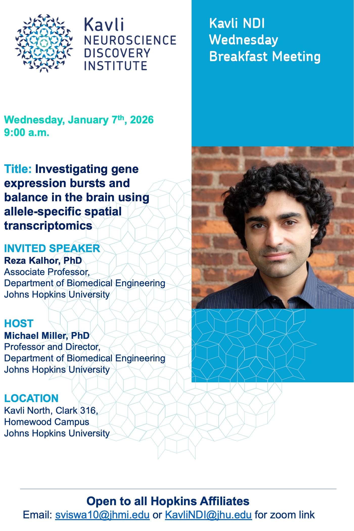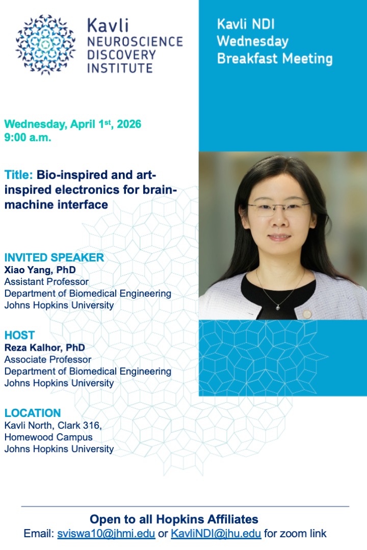 Kavli NDI hosts a monthly breakfast at our Homewood campus. This meeting serves as a forum to bring the Hopkins community together to brainstorm ideas, discuss current research, and set the stage for collaborative science across the community. Open to all members of the Hopkins community-- please email kavlindi@jhu.edu or sviswa10@jhmi.edu if you wish to attend.