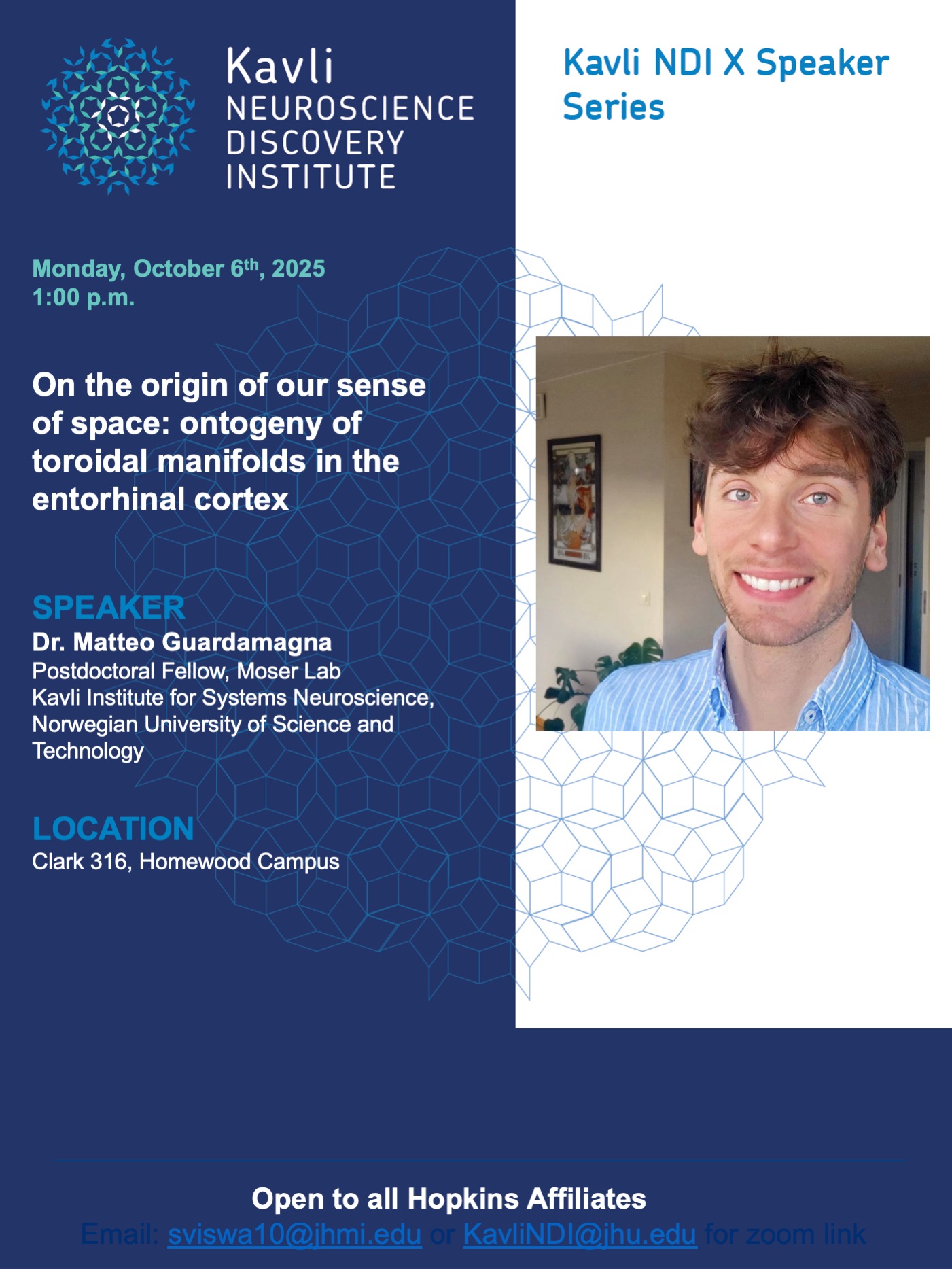 The Kavli NDI X series is a postdoctoral speaker exchange program, launched by Kavli NDI to foster interaction between the global network of Kavli Neuroscience Institutes across the world. Distinguished post-doctoral fellows are invited from the global network of Kavli Neuroscience institutes to showcase their research and exchange ideas with the Hopkins Neuroscience community. Please email kavlindi@jhu.edu or sviswa10@jhmi.edu if you wish to attend.